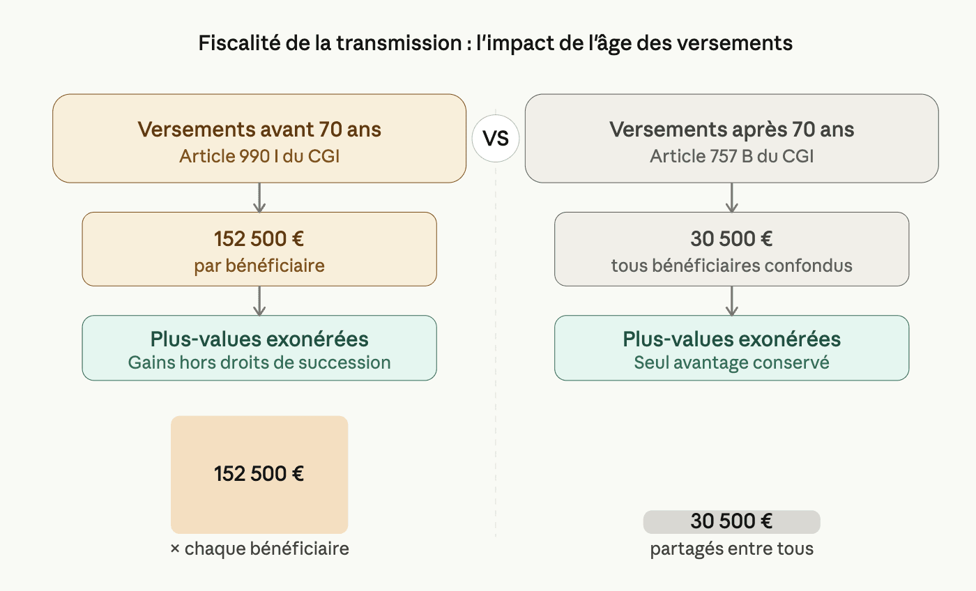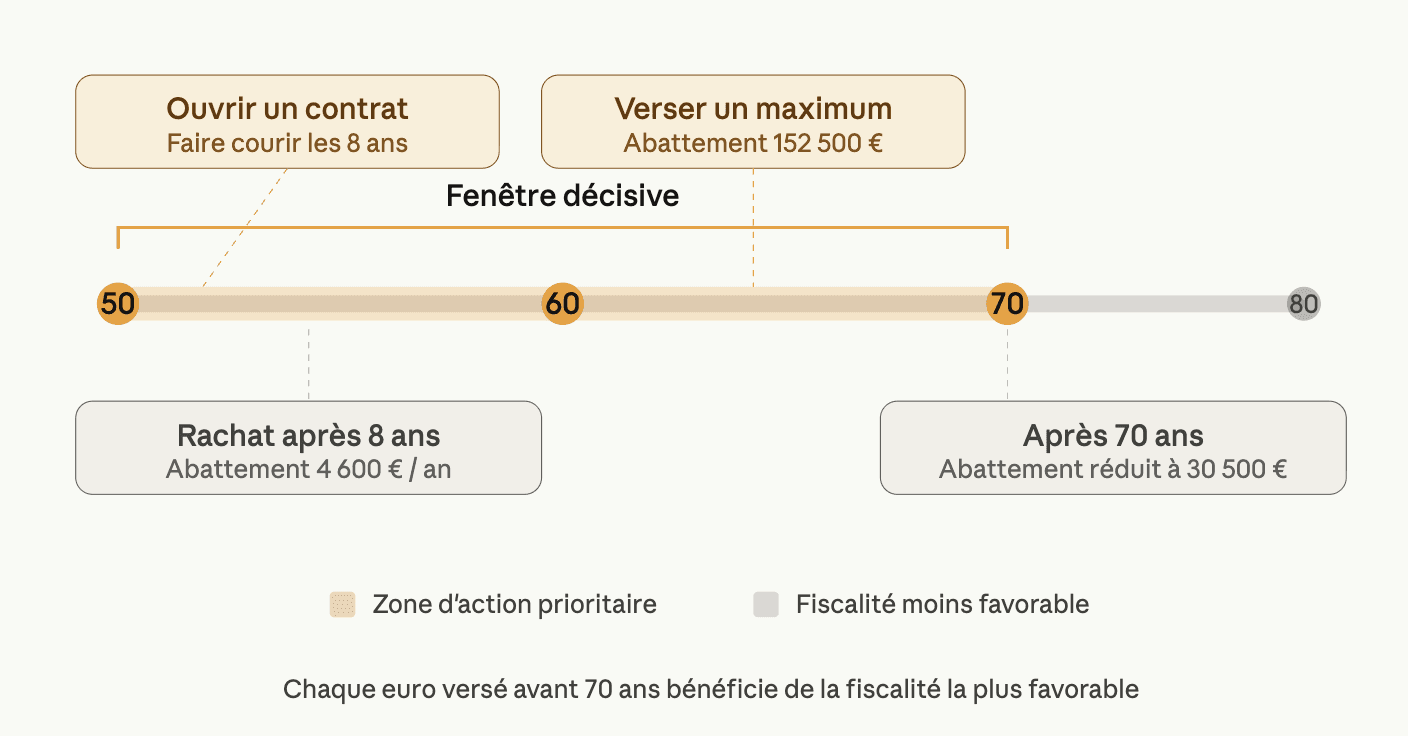 Le piège classique : attendre d'avoir 70 ans pour alimenter massivement son contrat. Si vous avez 55 ou 60 ans, chaque euro versé avant vos 70 ans bénéficie de la fiscalité la plus favorable. C'est un compte à rebours qu'il ne faut pas ignorer.