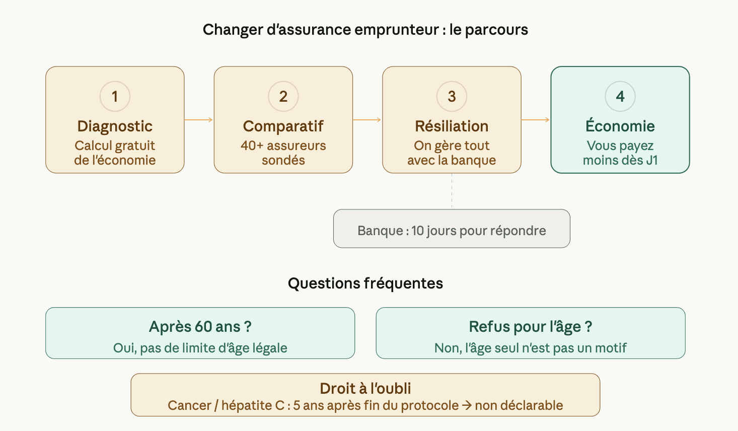 Depuis 2022, le changement d'assurance emprunteur est possible à tout moment, sans frais, quel que soit votre âge. Votre banque a 10 jours ouvrés pour répondre. Si elle refuse, elle doit le justifier par écrit, uniquement sur la base de l'équivalence des garanties.