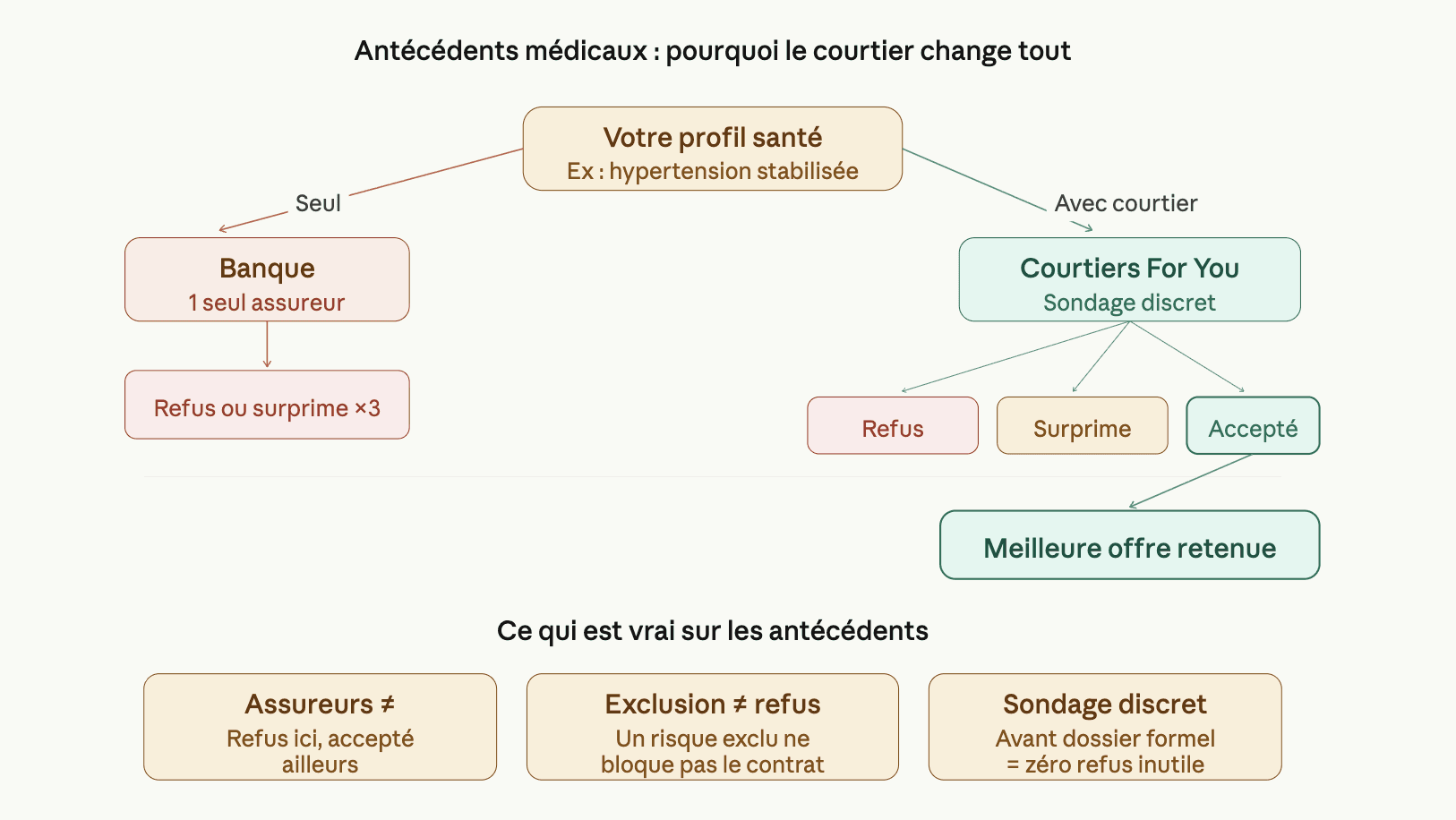 Au-delà de 60 ans à la fin du prêt, ou pour des montants plus élevés, le questionnaire médical reste obligatoire. C'est souvent là que le travail d'un courtier fait la différence : les assureurs ne se valent pas tous sur les antécédents courants (hypertension stabilisée, diabète de type 2, ancienne opération bénigne).